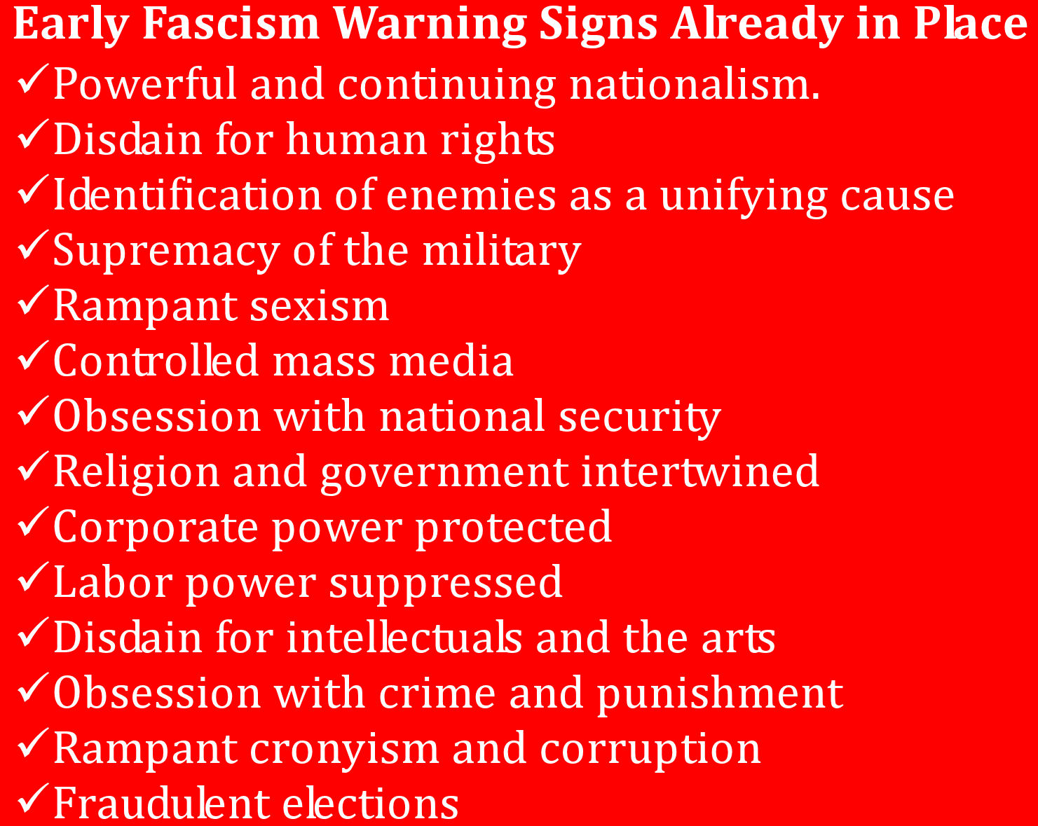 It's time to choose side, folks. You wonder about how Germany slid into fascism? Well you haven't been paying close enough attention, because we're already there. The GOP has checked off every single one of the warning signs listed.